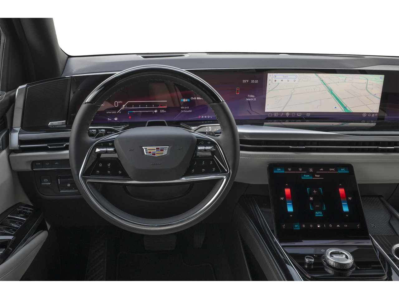 Stepping inside, you'll be enveloped in a world of refined comfort and advanced technology. The Escalade Sport's cabin is adorned with premium materials and features, including a 19-speaker AKG Studio audio system, a reconfigurable full-color head-up display, and a panoramic sunroof that floods the interior with natural light.
