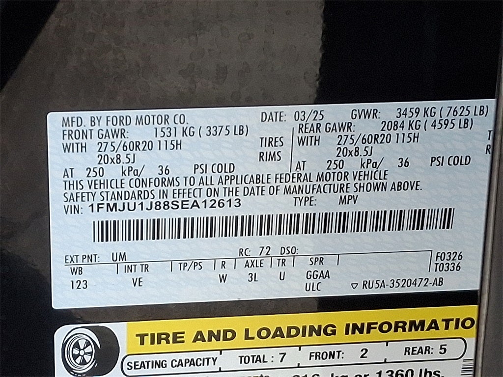 This Vehicle Includes the Following Options: Equipment Group 202A High Package (110V/400W AC Power Outlet, 26mm Engine Radiator, 2nd Row Power-Folding Captain's Chairs, 360-Degree Zone Lighting, 3rd Row Flexible Seating, 3rd Row Vinyl Seats, 4-Door Intelligent Access (Lock/Unlock), ActiveX Front Heated Captain's Chairs, BlueCruise Equipped, Flex Powered Console, Ford Split Gate, Front Side Laminated Glass, Heated Steering Wheel, Heavy-Duty Trailer Tow, Integrated Trailer Brake Control, Memory Driver Seat, Power Panoramic Vista Roof w/Power Sunshade, Power Tilt/Telescopic Steering Wheel w/Memory, Power-Folding Sideview Mirrors w/Autofold, Rain Sensing Wipers, SecuriCode Keyless Entry Pad, Universal Garage Door Opener, USB Ports, Wheels: 20 Carbonized Gray Bright Machined Aluminum, and Wireless Charging Pad), 4WD, 3.73 Axle Ratio, 3rd row seats: split-bench, 4-Wheel Disc Brakes, 6 Speakers, ABS brakes, Air Conditioning, Alloy wheels, AM/FM radio: SiriusXM with 360L, Apple CarPlay/Android Auto, Auto High-beam Headlights, Auto-dimming Rear-View mirror, Automatic temperature control, Brake assist, Bumpers: body-color, Cloth Front Captain's Chairs, Compass, Delay-off headlights, Driver door bin, Driver State Detection, Driver vanity mirror, Dual front impact airbags, Dual front side impact airbags, Electronic Stability Control, Emergency communication system: 911 Assist, Exterior Parking Camera Rear, Four wheel independent suspension, Front anti-roll bar, Front Bucket Sea