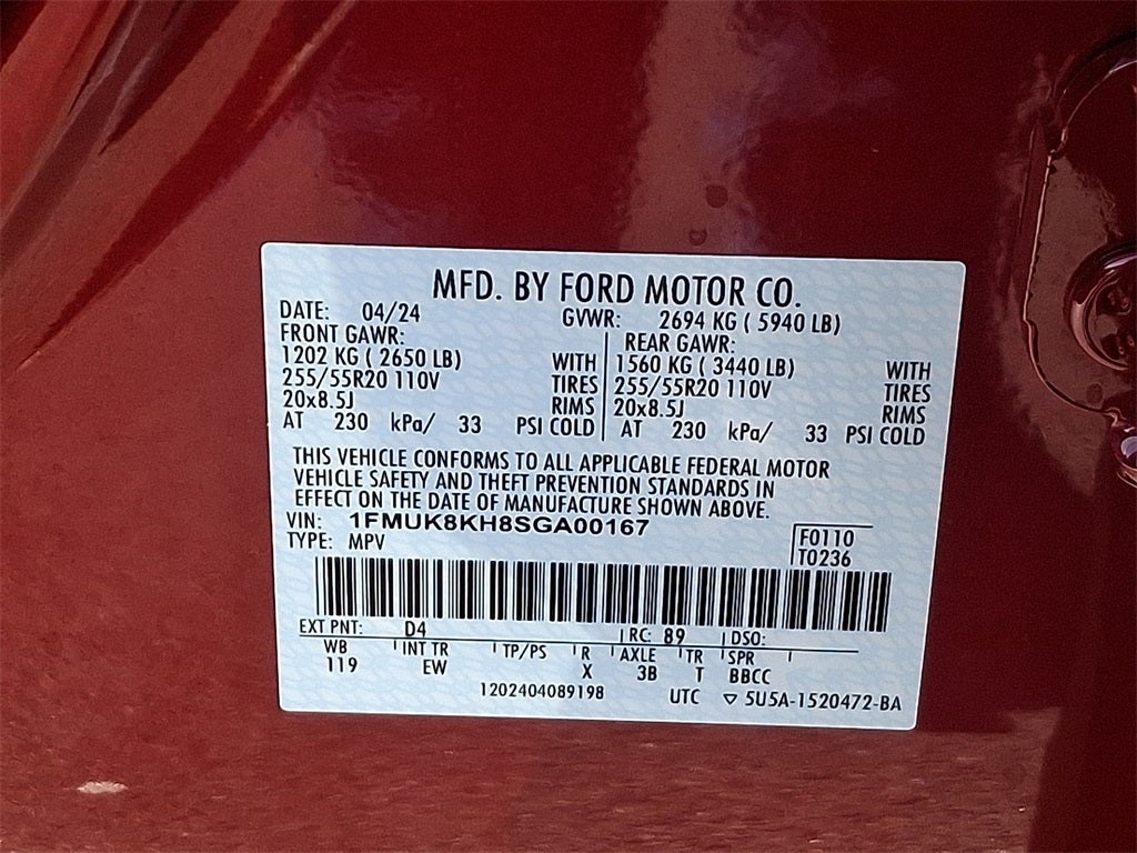 This Vehicle Includes the Following Options: Equipment Group 300A Standard Package, 4WD, 10 Speakers, 2nd Row Captain's Chairs w/E-Z Entry & Armrest, 3.58 Non-Limited Slip Rear Axle, 3rd row seats: bench, 4-Wheel Disc Brakes, ABS brakes, Air Conditioning, Alloy wheels, AM/FM radio: SiriusXM with 360L, Apple CarPlay/Android Auto, Auto High-beam Headlights, Automatic temperature control, Brake assist, Bumpers: body-color, Compass, Delay-off headlights, Driver door bin, Driver vanity mirror, Dual front impact airbags, Dual front side impact airbags, Electronic Stability Control, Emergency communication system: 911 Assist, Exterior Parking Camera Rear, Four wheel independent suspension, Front & 2nd Rows Floor Liners w/Carpet Floor Mats, Front anti-roll bar, Front Bucket Seats, Front Center Armrest, Front dual zone A/C, Front fog lights, Front reading lights, Fully automatic headlights, Garage door transmitter, Heated door mirrors, Heated front seats, Heated steering wheel, Heated Unique Cloth Captain's Chairs, Illuminated entry, Internet access capable: FordPass Connect 5G, Knee airbag, Leather steering wheel, Low tire pressure warning, Navigation System, Occupant sensing airbag, Outside temperature display, Overhead airbag, Overhead console, Panic alarm, Passenger door bin, Passenger vanity mirror, Power door mirrors, Power driver seat, Power Liftgate, Power passenger seat, Power steering, Power windows, Radio: B&O Sound System by Bang & Olufsen, Rear air conditioning, Rear anti-roll bar, Rear reading lights, Rear window defroster, Rear window wiper, Remote keyless entry, Security system, Speed control, Speed-sensing steering, Speed-Sensitive Wipers, Split folding rear seat, Spoiler, Steering wheel mounted audio controls, Tachometer, Telescoping steering wheel, Tilt steering wheel, Traction control, Trip computer, Variably intermittent wipers, and Wheels: 20 Ebony-Painted Machined Aluminum.